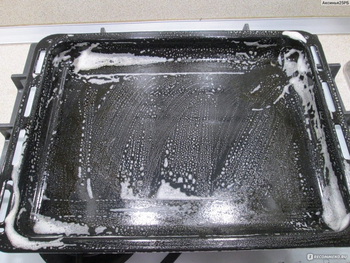 Wymieszaj te dwa składniki, aby uzyskać piankową pastę, a następnie wyszoruj nią plamy na blasze do pieczenia. Pozostaw na kilka minut, a następnie spłucz ciepłą wodą z mydłem.