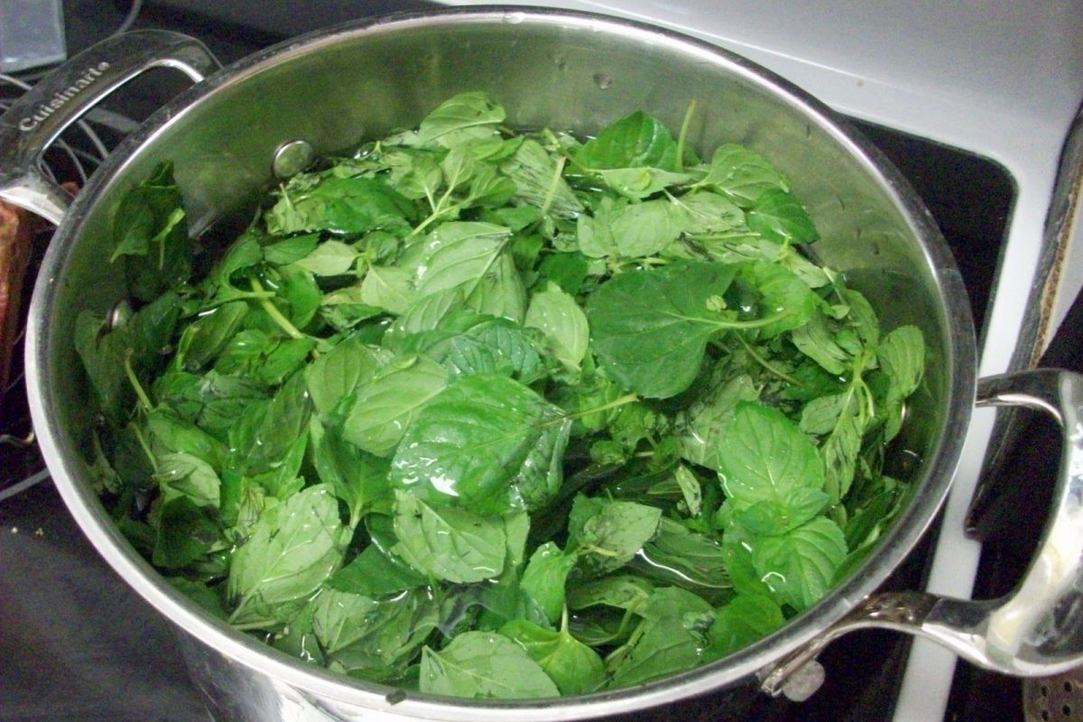 1. Umieść garść świeżych lub suszonych liści mięty w garnku z litrem wody.