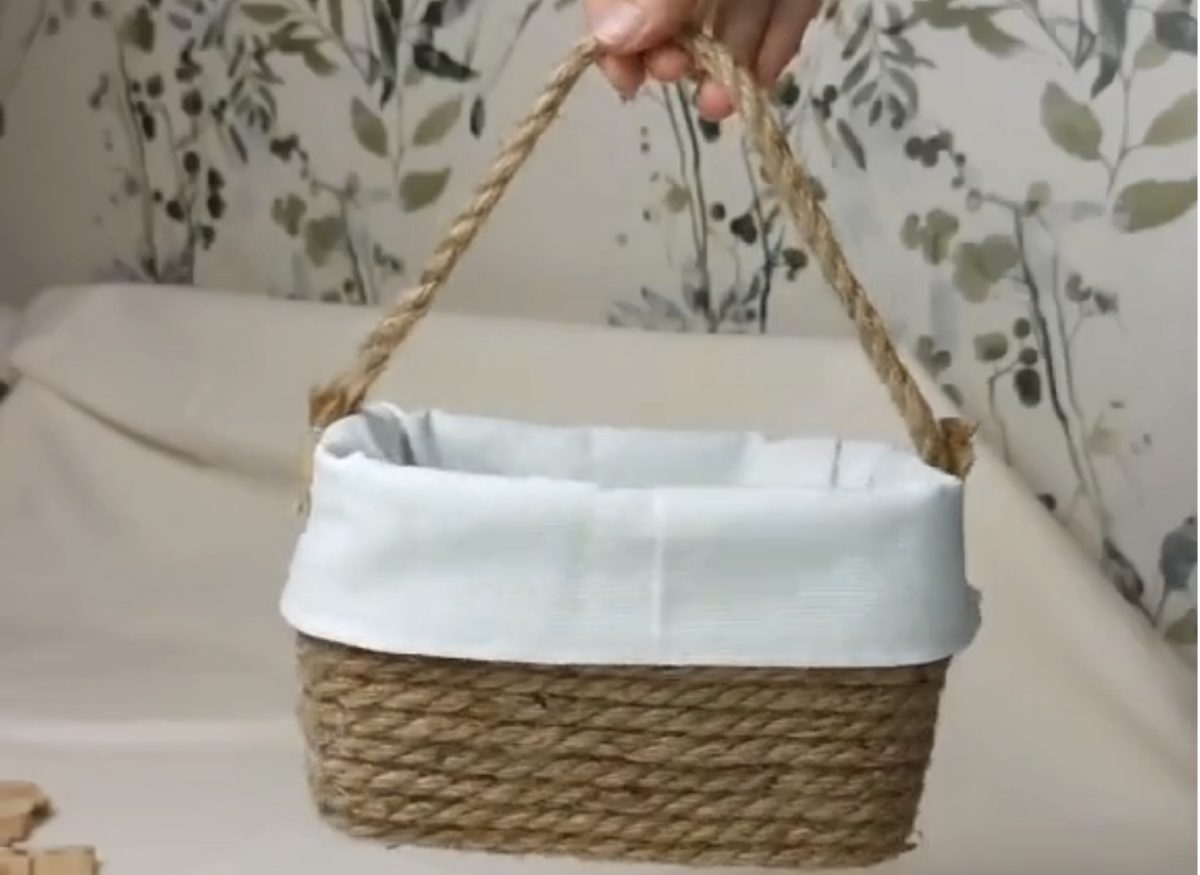 Wewnątrz dodaje się podszewkę z tkaniny, wykorzystując starą białą prześcieradło przycięte na wymiar. Ten szczegół nie tylko upiększa wnętrze, ale także chroni zawartość kosza i nadaje mu bardziej schludny i elegancki wygląd.